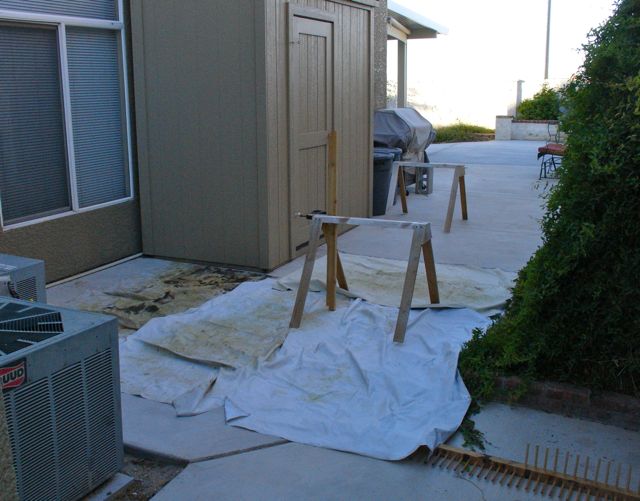 After the initial spray a few days ago I learned how to utilize my limited space at the side of the house to its best advantage. The sawhorse in the foreground has a 2×4 clamped to it to support the shelf for spraying. Once that’s done, the shelf is put into the rack you see at the lower right.