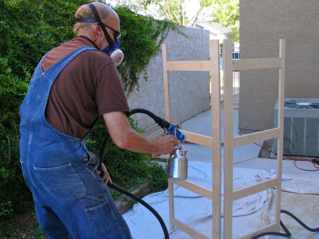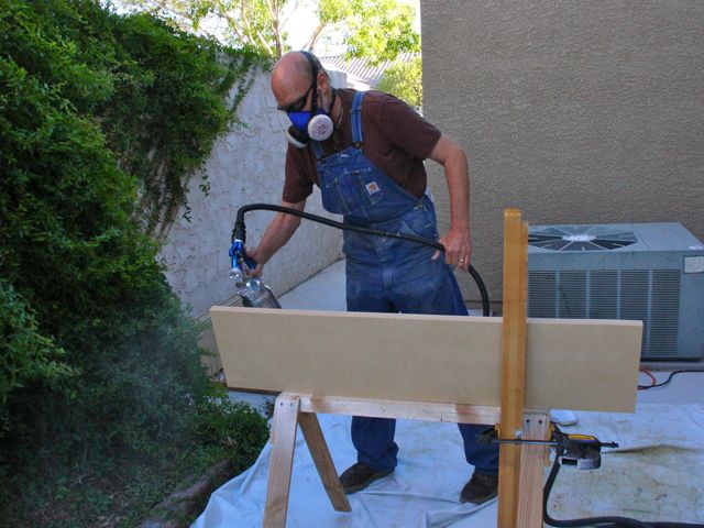 That sawhorse holds the shelf securely, HVLP does shoot out a pretty powerful blast of air and since the shelves are light I had some problems the first time out.