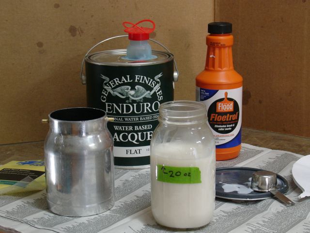 Here’s what was on this mornings menu. Probably could have used a roller or brush but with our temperatures in the 80+ and humidity around 5% that just wasn’t in the cards! When we re-modeled the kitchen I bought an Earlex, 3 stage HVLP sprayer. General Finishes makes a waterborne lacquer which we bought locally (always a plus) in a flat finish. Because of the weather conditions this was thinned 10% with Floetrol. Using a 1.5mm needle worked great. I poured 20 ounces into the mason jar, then added 2 ounces of the Floetrol and was happy with the results.