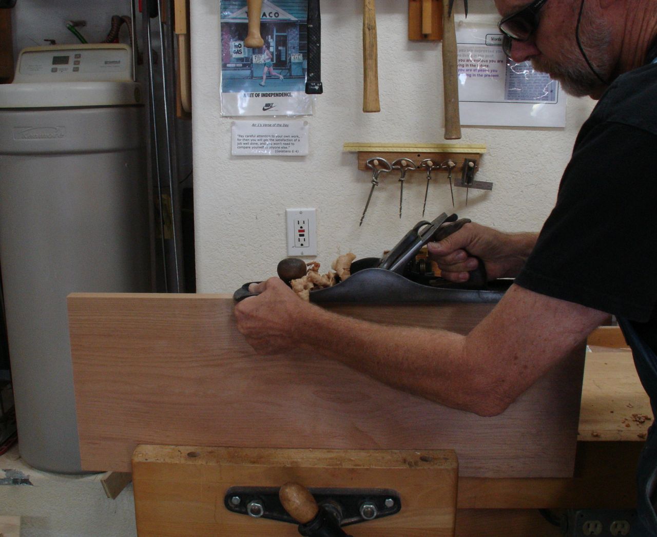 The first step was to laminate two pieces for each side. That begins with the tablesaw and ends by jointing the edges that need to be joined with a jointer plane.