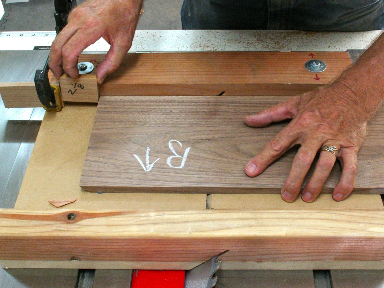 The purpose of following this procedure is so the grain on the box is continuous all the way around. You can’t simply cut both long pieces, reset your stop block and then cut the two shorter pieces. The grain won’t continue, that’s why there is the chalk marking to indicate the order of the piece and also the direction it should be oriented during glue up. Next up was to make the lid. The design calls for a seamless lid that is solidly glued to the entire box — I know what you’re thinking; what about wood movement? There is a man on Lumberjocks who uses the name of Boxguy who uses this method. I’ve had some correspondence with him and he assures me he’s been doing this for 10 years and never had a problem, he thinks it’s because the small size of his work doesn’t have enough wood movement to affect it. This possibility was discussed and we decided to go ahead with this for the Mystery Box. To create the 1/2″ rabbet all around the top and bottom pieces I used the table saw as shown below to rough it out which was followed by accurately sizing it with a rabbet block plane.