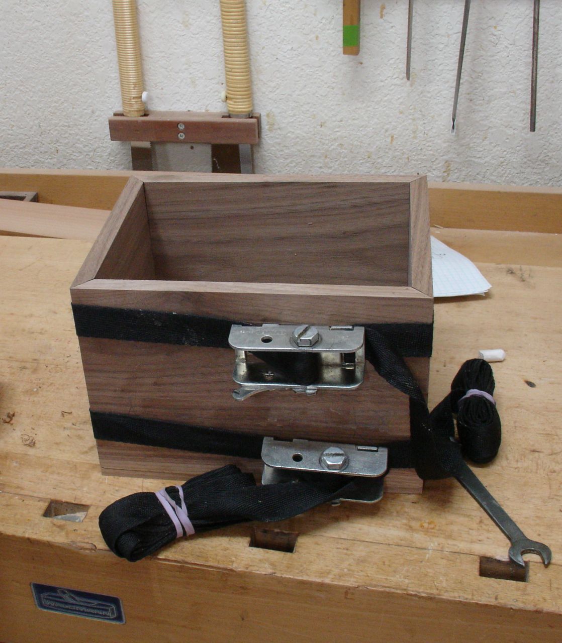 In the meantime, I’ll continue to use this prototype to work out a latch system. If you can picture how the two clamshell lids will close you can imagine the unique situation we’re facing. A perfect solution would be an antique type drawer lock but since these two close on to each other that may not work. I’m partially done designing a drawbar system from brass. As for now, the box with the separated corners has been glued and clamped as a temporary fix to work on the hinge and latching system for the Mystery Box.