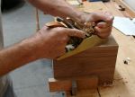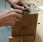 Entire piece was allowed to dry overnight and then began the process of making this look like the examples they had shown me. The inspiration for them was some leather bound ledgers and had something to do with the bottle of liquor it held. The inside depth specified for the lid was 1 1/4″ and this lid was to be a 1/3 — 2/3’s split. Before separating them though I used planes to smooth out the surfaces and edges.