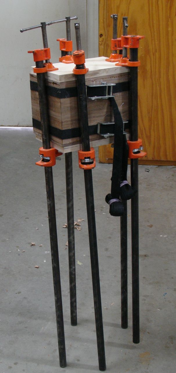 Assembly was started by applying two rows of packaging tape to hold it together initially followed by two band clamps. Once that was together the top and bottom were attached and clamped like the picture at the top of this blog. Kind of looks like a modern art sculpture in that photo doesn’t it?
