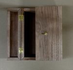 Creating the mechanism was pretty interesting too! It began by taking the pieces of Walnut that were destined to be the inside of the lids and cutting a mortise out of them sized for the brass latch piece. There has to be a way to hold some tension on that latch and a ball catch for a cabinet door was the answer for that. I happen to have a couple leftover from a long ago project. Oddly enough it was the lady from the couple who saw one of them in a catalog when we were doing our brain storming. She asked me what it was and I’m sure that’s what jarred my memory and made me think of using it for this application.