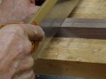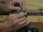 One big question we had was coming up with a way to make the latch. The three of us looked through catalogs and on the internet but nothing seemed to fit the bill. This was fun, gave me a chance to do a little bit of metal work and combine it with the woods. Workbench looked a little different for that, a piece of .064 thick brass was cut and tapped to accommodate a 10/24 screw. You can see in the photograph the piece of brass in the vise. The assembled “latch holder” is at the left side of the box lid, notice the line of scratch awl marks — that’s where I needed to create a slot for the screw to travel in.
