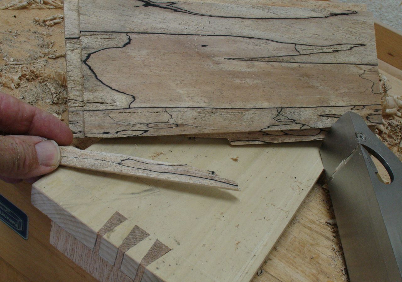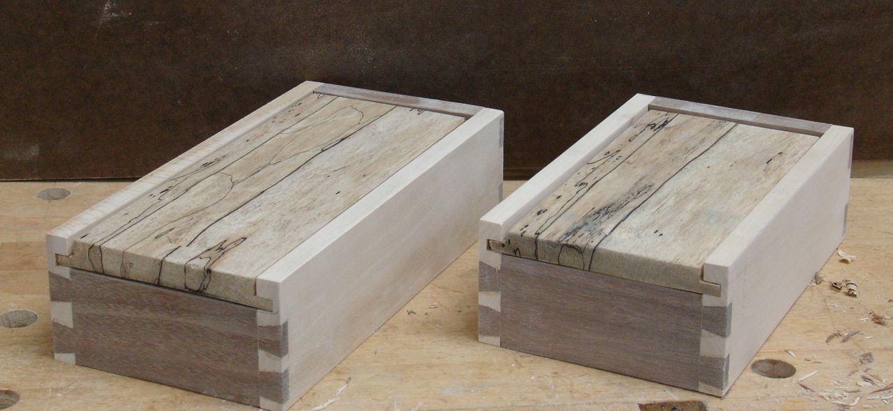 Work is progressing nicely on the sliding lid, dovetailed boxes using the pieces of Spalted Maple I received as a gift. If you recall my last post I referred to this wood as being “punky” — wonder what that means? I’ve always used that to describe a wood that is soft and spongy feeling but Googling it I also learned that it’s wood that is ideal for starting a fire! Whatever definition you use, it can be a challenge to work with. The only previous experience with it was to make my drafting table and in that instance I had several wide boards to laminate together. You can use Cyanoacrylate glue to solidify the wood fibers. Here’s a LINK that’ll give you information on this glue, commonly referred to as CY.