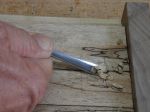 The Cy glue was used to solidify some of the edges and replace small bits that came off as the lid was formed. My next challenge was to design a way to slide the box open. You may have seen a hole drilled completely through but that didn’t appeal to me. Besides the roughness of the edges I was betting that with the characteristics of this board there would probably be a lot of tear out. I’m after subtle so used some of the remnants of the failed lid to experiment with carving a finger depression into the lid. Here’s a photo sequence of how that worked out: