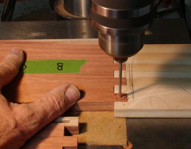 Side placed in Jig for first hole. The Pine piece is the Jig.