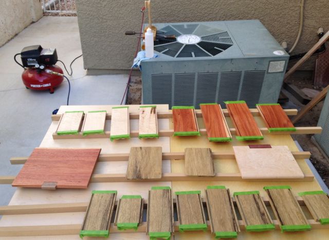 These boxes will be finished with platinum shellac which I mix fresh from flakes and the easiest way to go about that is with an airbrush. Since several of the boxes are fairly large, plus the lidded finger joint style has the lid attached when it’s finished I decided to spray the insides before assembly. After smoothing both sides of each piece tape was wrapped around the joints so they wouldn’t get any shellac on them. That would tend to seal the woods pores and weaken the glue joint. The day was an unusually cool one for us and even though we had some rain last night I decided to go ahead with the shellac anyway. Diane and I went out to lunch and wouldn’t you know it, rain drops were falling on our heads! Shellac and water don’t make for a good mix but I was blessed and it didn’t rain at all at our house, only at Panera’s about 3 miles away! The interiors were given two coats of shellac and will be finished with wax after final assembly. The picture shows how things looked when we left for lunch.