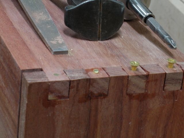 The final steps to this were to insert the brass screws and then file them down after snipping off the heads. As you recall, all of the holes were pre-drilled before the box was assembled using a jig on the drill press that located them exactly. My personal thoughts are that this small, brass detail adds a lot to the over-all appearance of the box.