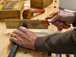 That’s the hand cut way, for the hinges I use a small trim router with a ball bearing guided bit and a jig. By the way, here’s what my work area looks like when I do these types of things. Being in my sixth decade the back and eyes aren’t what they used to be! This is the carving bench that’ll save your back because you don’t have to bend over all day. I use this for carving, cutting dovetails, and any other work where I need to position the work higher. The light is an LED one that slips over the dowels that normally hold my coping saw.