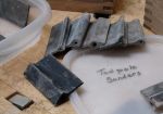 My client has expressed an interest in wood and the craftsmanship of having a custom box made so I thought it’s only fitting to have a solid, wooden bottom for his project. Usually I’ll use plywood for that and line it with ultra suede. This box has a 1/4″ thick piece of solid Walnut for the bottom. In one of our conversations he asked about dating and signing it with a fine marker. I always burn my logo into my work but to this one I added a stamped in date. That’s what I use for picture frames and the trick I’ve found for keeping the letter stamps aligned is to tape down a piece of 1/4″ graph paper and stamp directly onto it.