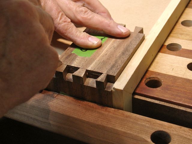 Using a guide jig, tails are transferred to pin board.