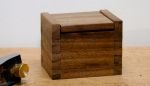 The trick with assembling a project like this is that everything has to come together all at the same time. The procedure was to apply liquid hide glue to the pins of the back piece and the corresponding tails of the side pieces. Next the washers were placed on the pins and the lid and bottom inserted in place as the joints were pushed together. After that subassembly is almost put together the process is repeated with the pins/tails of the front of the box and things are quickly aligned, joints are bottomed out, checked for square, and then clamped to dry overnight.
