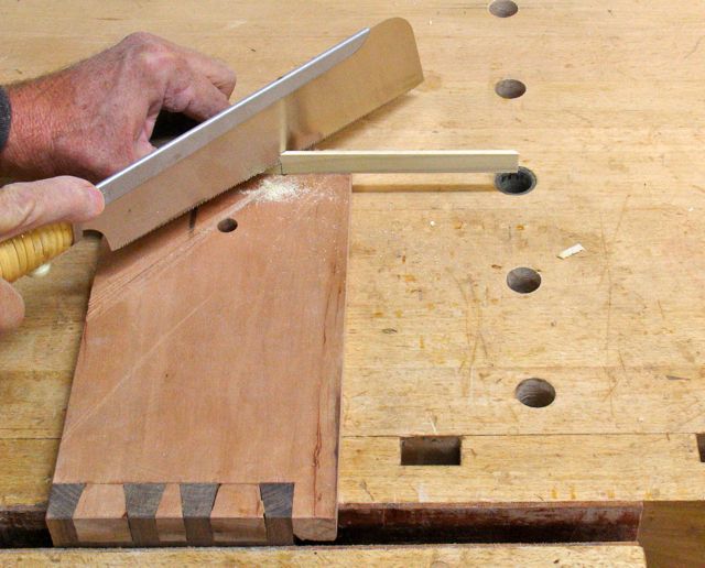 After ripping pieces to width they are mitered with a Japanese saw and a bench hook.