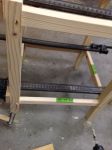 Assembly was pretty straight forward. The upper stretchers were easy enough to label and keep track of. I usually mark them with machinists stamps on the tenon and face of the mortise. Once assembled, these marks disappear. The bottom stretchers though were too small so were marked with painters tape. Once pegged, the clamps could be removed. The Douglas Fir is pretty soft so draw boring wasn’t a real difficult option. In any case though, clamps were left in place until completely dry.