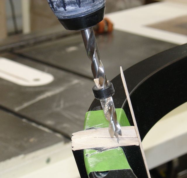 Stick clamped on leg to guide drill bit angle.