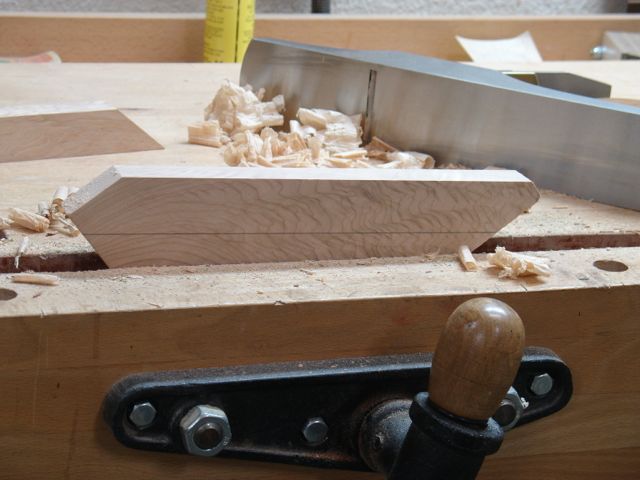 DrawerPull-BigLeafMaple-3Next up was giving it some shape and design.  This was accomplished with a block plane.  After penciling in guide lines, chamfers were cut on the outside edge.  If you look closely at the shavings that came off the plane you may notice that they are “crinkled”.  I think that has to do with the grain structure of the Maple.  Once that shape was finished I just had to see what the piece would look like so proceeded to mortise a scrap of Sapele and stick it in.  Since I was this far off track I might as well run a coat of shellac and see what that would look like as well!  Looked pretty good but I felt it needed something else, the grip wasn’t quite right.  That was remedied by cutting a shallow groove with a core box router bit.  Here you can see the difference but the real difference comes in the feel.