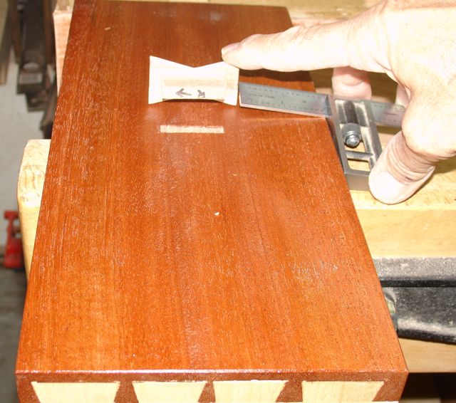 I chose three of them for the project and fitted them to the drawer front. A slight dilemma here was the finishing process. It would be difficult to finish with the pull in place as I’m doing combination brush and padding with the shellac. My concern was getting shellac in the mortise and on the tenon. To solve that dilemma I will wait until the shellacking process is done, then trim the mortise/tenon to fit and glue them together before the finish is rubbed out. After fitting the pull it was marked for the drawer and an arrow to show which direction faces down. Here I’m using setting the distance from the top of the drawer to the top of the pull (2″).