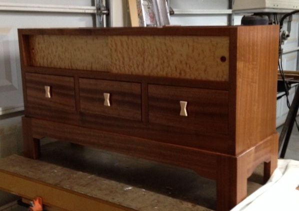 WoodworksbyJohn-HDTVStand-Dovetails-relationship-1The design concept of this piece was the use of dovetails through-out.  That’s the unifying detail.  The pulls were based on that design element and here you can see how it all works together.  Obviously the pull is shaped like a dovetail, then the drawer dividers is dovetailed into the shelf and bottom stretcher.  That stretcher is joined to the side with twin dovetails.  I think one of the more challenging aspects was hand cutting these joints into the Sapele!  It’s beautiful in my opinion but the interlocked grain was difficult to work with chisels but that’s okay, just adds to the challenge.