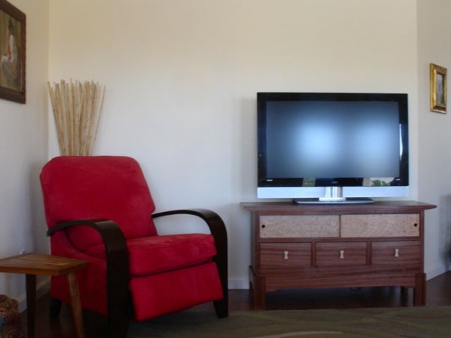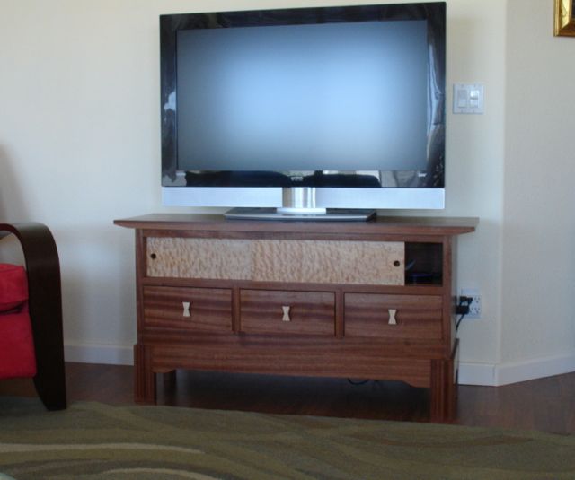 As far as the over-all design I think the upsweep on the edge of the top gives it an Asian feel.  The Sapele, although difficult to work, has some beautiful grain patterns that flow across the drawer fronts.  Hard to photograph the top but the grain mimics the drawers with a bit of swirl on the front edge to add even more interest.  At 26 1/2″ high, the televisions viewing height is just right.  Ideally I’d love to make a cabinet that incorporates a  TV lift but having done one for a client I know the price of a quality lift is just not in our budget!