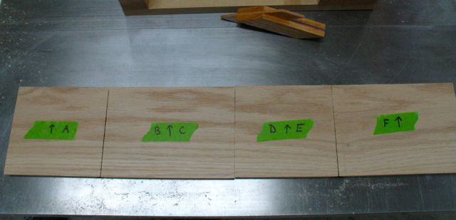 Parts laid out as cut, then marked so box can be assembled with continuous grain.