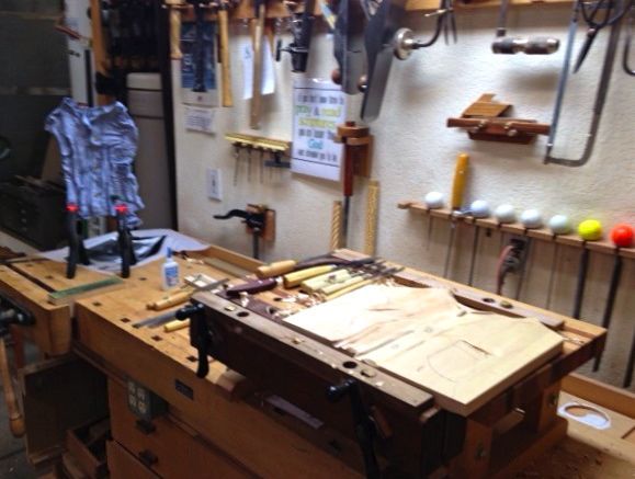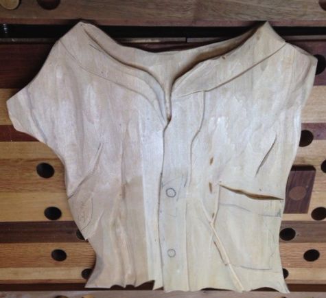 Here is my work area set up for this project. The shirt is so stiff that it’ll stand up on it’s own with the aid of some clamps! I absolutely love having my portable bench, not having to be hunched over the bench at my age allows me to work at a more comfortable level for my back plus I can see (pretty much) what I’m trying to carve. Lighting and being able to hold the wood in any position is important as well.