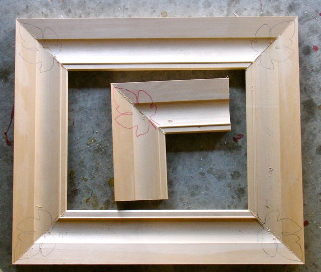 Speaking of which, here’s the frame ready for carving and gilding. Carving is a challenging activity for me — the process of making a flat piece of wood appear to have life and dimension is appealing though. The leaves are drawn on each corner and I decided to make another corner sample to use for selecting the proper sweep and size of chisels. Being able to do that rather than utilize a V-chisel or knife will make the over-all carve more definite. That’s the traditional way of carving but requires a huge assortment of chisels and gouges which I don’t have — have to work out the design with the tools I have.