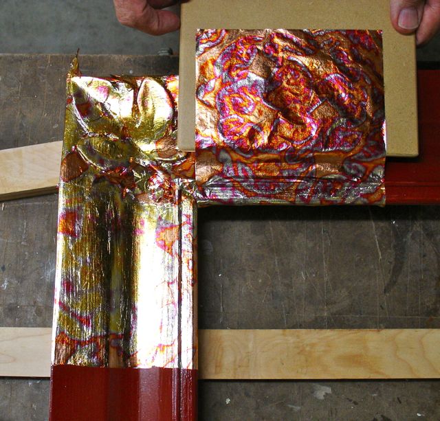 I talked about the differences of oil gilding vs. traditional laying of precious gold leaf on a gessoed surface. Oil gilding is so much easier but if you look at gilded frames you just can’t duplicate the genuine, 22kt. gold leaf. To do oil gilding the first step is to burnish the sealer using 4/0 steel wool. I always use and recommend the Liberon brand which is oil free. Next is to brush on a very thin, uniform layer of your oil size. Quick size will set up in an hour or so to achieve the proper tack and has a 2-3 hour window when it is at the correct tack for gilding. Slow set size needs to set up for 10-12 hours before it reaches the proper tack and can be worked for up to 24 hours. In the picture at the left I’m demonstrating how to check for that “proper tack”. You track your knuckle across the surface and you’ll feel and maybe even hear a distinctive sound. How to describe a sound?, well; as a mischievous grade school student I’d lick my thumb and then drag it across the desk making a class interrupting sound — ever do that? That’s similar to the sound and feel of a “proper tack”!