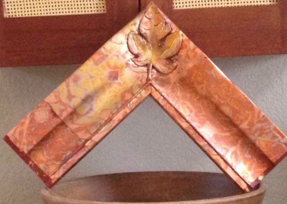 We’re always learning something, having never used a variegated leaf before I didn’t realize it has a good and bad side. I had a 50/50 chance and laid the first corner sheet with the back side up! Once I realized my mistake I marked the top of the package and also noticed that it’s the side that has some printing on it. The leaf comes in a book of 25 sheets, separated by thin sheets of tissue paper. You can see how garish the back side of the leaf is and of course, I started on the corner! Since this is my sample piece it’s not too big of a deal, just kind of aggravating.