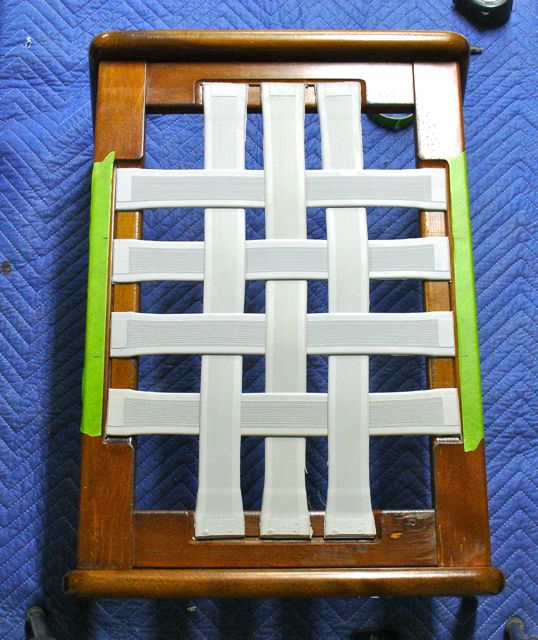 The Evans Company imports many different sizes and each strap is marked with their item number.  Wisely, when I made out my order I noted which straps go to which piece of furniture.  I was anticipating a lot of arm work but it wasn’t too difficult pulling them tight and snapping the angled clip into the slots.  There was some friction to overcome as they became interwoven, the rubber tending to grip together.  Marks were made on some tape to get the spacing as even as possible.