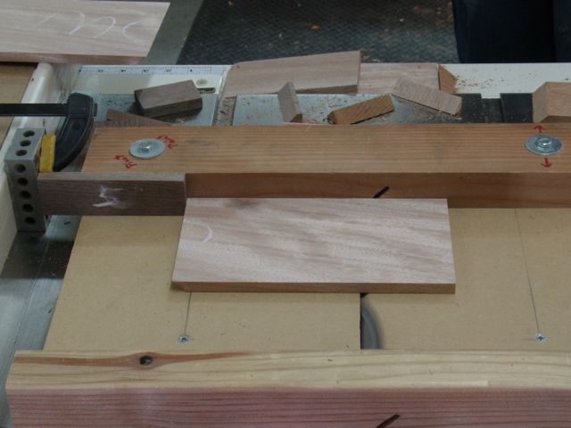 A stop block is clamped against the fence to allow for clearance and the first piece is cut.