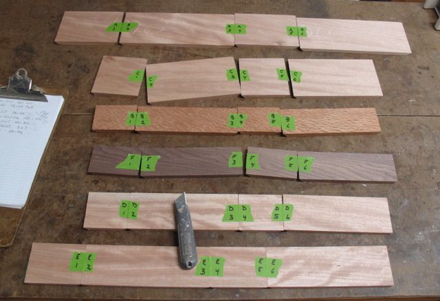 Flip and trim, remove the spacer to cut the longer side; flip, trim, and repeat. It’s important to keep the pieces in order as you cut them to ensure continuous grain flow. Marking them with tape is the most fool proof way for me to keep things organized. As I mentioned, I’m also making several other boxes to add to my stores inventory so at the end of this phase here’s what I had: