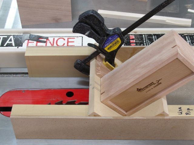 The final step for the construction of these boxes is to cut slots to put keys in the mitered edges. The beauty of a mitered joint is that the end grain of the wood is hidden. The downside is that having end grain to end grain as your gluing surface there isn’t a lot of strength. To compensate for that, a slot is cut across the corner. This exposes the long grain of the wood so by gluing in a key of long grain wood the corner is now reinforced. Usually this key is of a contrasting wood which adds a decorative touch to the box. This process is accomplished with the tablesaw jig shown in this picture. You can see the cut already made on the box.