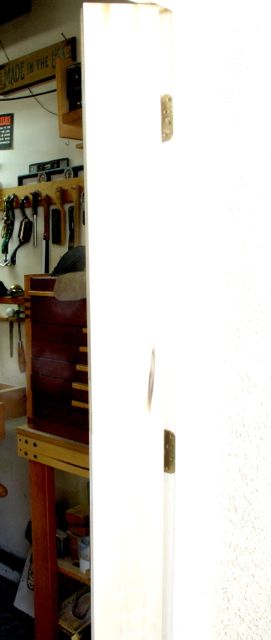 This is a strange picture to say the least so I’ll try to explain what you’re seeing. The lighting and then white against white makes it a bit hard to distinguish — actually it’s a really crappy picture but I can’t adjust it any better so please bear with me. Since this is a solid 8/4 Poplar door (2/8 x 6/8) and I’m a one man operation I thought to myself: “do I want to fight this heavy door and put out my back?” Obvious answer was no! So why not just set the hinges on the hinge stile of the door before assembling the door? Well, since I couldn’t think of any argument against it, that’s what I did. What you’re looking at is the hinge side of the door, pivoting nicely on the existing hinges. To get to that point the center hinge was removed to make a template out of some 1/2″ plywood.