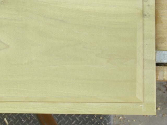 In the first post about this door I talked about the joinery and stock preparation. The first piece to be assembled was the bottom and middle rail with the center stile. To fill this area in there are two, 1″ thick Poplar panels. They were initially formed with the use of a dado head to cut a 1/2″ long by 5/8″ wide tongue on the center of each panel. These were trued up with a rabbet block plane and then a chamfer planed all around. After penciling in a limit line the end grain was done first then the edges brought to them to get a crisp, mitered edge. You know I absolutely hate to paint wood and had really thought about just clear coating this door with an exterior varnish but it really would look odd so they were painted white before assembly; however, I couldn’t resist hand planing them to get my optimum finish!