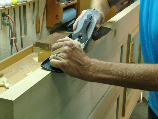 The only thing done after assembly was planing a slight angle on the strike side of the door. The original door was 1/8″ smaller across the width on the front so that’s what I used to lay out my line. I then planed to the line using a small bevel square to check my progress.