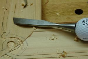 Now the work begins. I suppose that oft quoted saying of “ask 10 woodworkers the same question and you’ll get 12 different answers” applies to this project. A few years ago I took a carving workshop from Ian Agrell where I learned his techniques. Essentially, each curvature of the carve is first outlined with the appropriate sweep and size of chisel and then the background is removed. Well, it didn’t take long to discover that this requires a huge number of chisels ($$$!). A friend of mine here in Las Vegas, who is quite an accomplished carver; uses a knife to do almost all of the initial outlining. I’ve had some success with that process but have a hard time making smooth curves as my hand seems to be in the way of seeing the line. So, I improvised by modifying a double beveled, skewed chisel for this purpose. This was a Marples, blue handled chisel I’d had for years but never cared for the look and feel of that handle —- enter the golf ball!