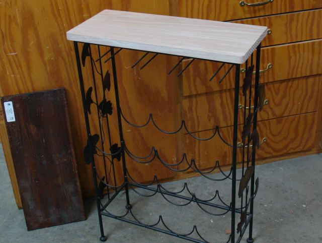 Quite a number of years ago we had re-purposed a media niche in his home by my building a liquor cabinet for the lower part of it. The upper part of it was mirrored with glass shelving to hold bottles and glasses. All that was missing was a place for wine. Oh yes, you may have heard me say that I very rarely stain — this project was one of my few exceptions. Their kitchen cabinetry is adjacent to this wall and has a pickled, white wash Oak finish so this cabinet had to match. I also added an end table with the same finish at a later date. He had purchased a wine rack that had a dark, antiqued wooden top on it and wondered if I could replace the top to match the rest of the woodwork. In this picture you see the finished project along with the original top.