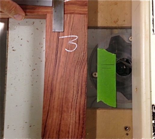 The next step to creating the top was to cut a groove that would house and support the plywood.  The tricky thing here was keeping all of the pieces organized and make sure the proper face of each board was held against the fence.  Let me explain what you’re looking at, the marks on the green tape indicate the beginning and starting point of the router bit.  The groove doesn’t run the full length of the pieces so they will have to be dropped down and picked up from the cutter depending on the location.  Since the groove depth is 3/8″  the edge of the board needs marking to tell me where to start and stop each cut.  Due to the hardness of this wood the cut had to be made in two passes.  The face of the board needs to go against the fence so the backside was marked with chalk — every time I picked up a board my mantra was: “see the chalk before you cut” and it worked!
