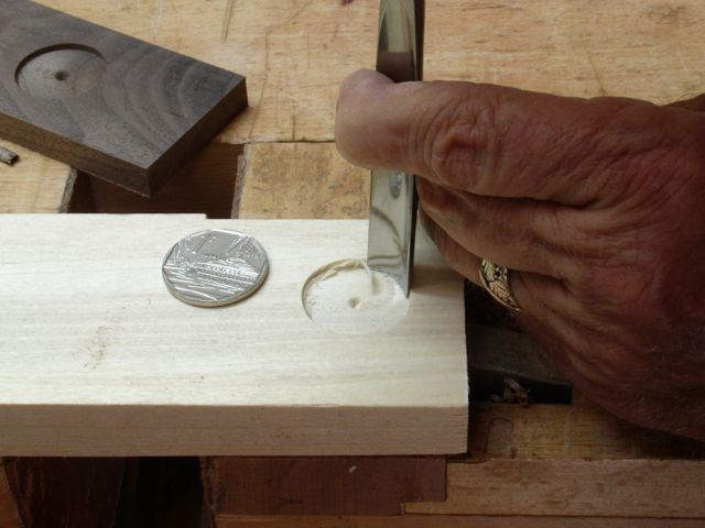 1.) Tried to enlarge 1″ diameter hole but bevel of chisel created a ridge
