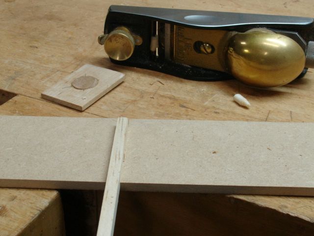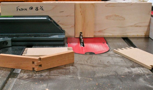 The next step is making a key that fits the dado exactly. Make the key longer than what you need for the carrier piece, you’ll use it to set up the jig. You can either cut some dados or use the MDF as a guide. I think using a scrap piece and cutting dados 1/2″ deep will give you a more accurately sized key. This is glued into the dado on the carrier piece. At this time I like to glue a piece of wood on the back side of the jig where the blade comes through. This acts as a “no go zone” for my fingers when cutting the joints.
