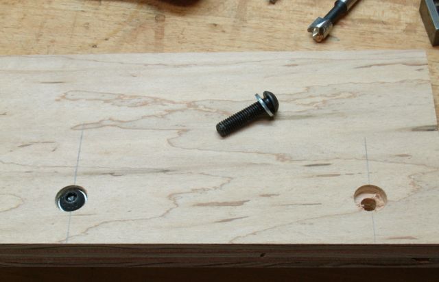 The first step is to locate and drill the holes used to mount the plywood piece to the sliding arm. Including the 1/4″ MDF carrier they are 1 – 3/32″ from the bottom. Use a 1/2″ forstner bit to drill a counter bore so that the buttonhead capscrew and washer are flush with the surface. Use a 1/4″ bit to complete the hole for the capscrew. Not too critical of a measurement but I located them at 1″ and 6″ from the left of the board when viewing it from the back.
