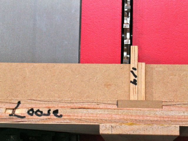 Attach the jig to the slider arm snugly. Use the extra key piece to align the blade. For testing I’ll use some 1/4″ MDF to make the initial cuts. This process gets like Goldilocks and the Three Bears! First too tight, then too loose, and after a few more “tastes” it’ll be just right! Took me about 7 tries to dial this one in to my satisfaction. Too loose means you move the carrier to the right, too tight to the left. I use a sharpie and write on the jig so I remember. Doesn’t take much to throw everything off. It’s also wise to use a test piece that is as wide as the pieces you plan on jointing. A minor discrepancy is magnified if the board is 5-6 inches wide.