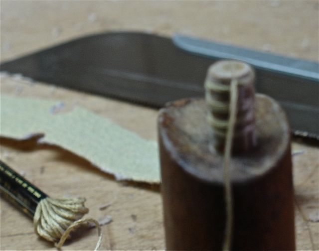 Another observation I made was that the stretcher holes appeared to have been distorted as people sat and moved about in the chair over the years. My solution for that was to wrap them with some cotton thread to “fatten” them up. Cotton will absorb the glue, expand, and tighten that up. After cutting a shallow kerf in the end of the dowel to secure it, several turns of the string were wrapped around then brought back into the kerf to lock it in place. I experimented with some 3/8″ dowel stock to see how many winds of string I could use and still be able to fit the dowel into the existing hole.