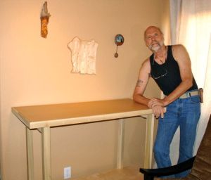 Now that all was set the pieces were brought upstairs for assembly. The study is painted a light, peanut butter color which really created an odd color cast on these pictures but you can get the idea of how it went. The shelf simply fits between the legs and is left loose. The top is bolted to the stretcher, there is a piece of Poplar glued/screwed to the underside of the top which you can see in the slide show here: