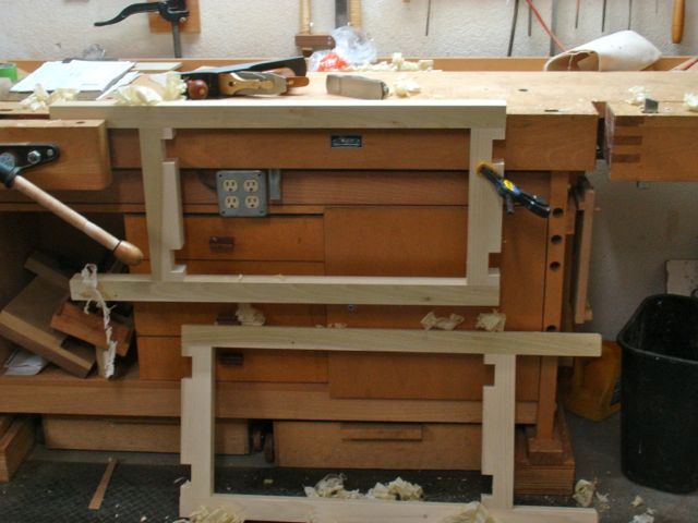 We have a spiral staircase which made having this be a knockdown affair crucial. Light weight was another consideration so I chose 8/4 Poplar and 3/4″ Baltic Birch ply for the materials. Stability was important as well but most picture frame carving is of low relief so the bench doesn’t need to be as stable as my main bench where you’d use a mallet as well. For me, at 6’2″; the height of the bench is very important. This one is 39″ tall which makes it a good height, harder to straighten up the more years I add to my life! When I carve, the portable bench I use will add another 10″ to my working level which is comfortable for me. The top measures 21″ in width and 45″ in length.