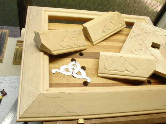 Due to the strange angles at the miter the border around the knot was no longer parallel to the edges of the frame when the pattern is bent over the miter. That problem was overcome by drawing parallel lines for the border. This meant that even though the border is parallel, the knot is angled upwards. In her video, Mary said to treat the outlining of the knot more like a chip carving. Rather than using a gouge to form the radius, an 8mm straight chisel was used to carve around the outline. This was an interesting process, I needed to constantly keep in mind the angle of the cuts in relation to the angle of the molding profile. You can see how the initial drawing looked in this picture. The challenge was to keep the sides straight and correctly angled — that was challenge one!