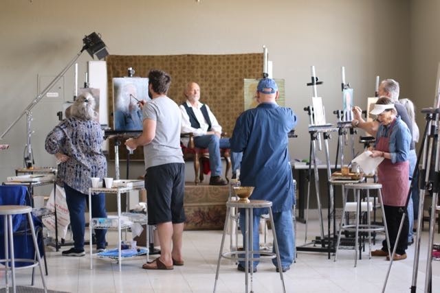 After lunch the first day, the students in the class drew numbers to see which easel position they would have. I taped my foot location to help me return to the same position after each break, found an object across the room to focus on and prepared for sitting still — not as easy as you might imagine! Having done this before for groups in Las Vegas I knew what to expect but a 6 hour posing day was a bit more challenging than the 2 hour ones there. You just don’t move or scratch an itch instead plan stuff in your head, sing songs (silently), and enjoy the process. And enjoy it I did! Michael was constantly answering questions from the students and doing impromptu demonstrations on their canvases. I suppose you really had to be there to get a full appreciation of it.